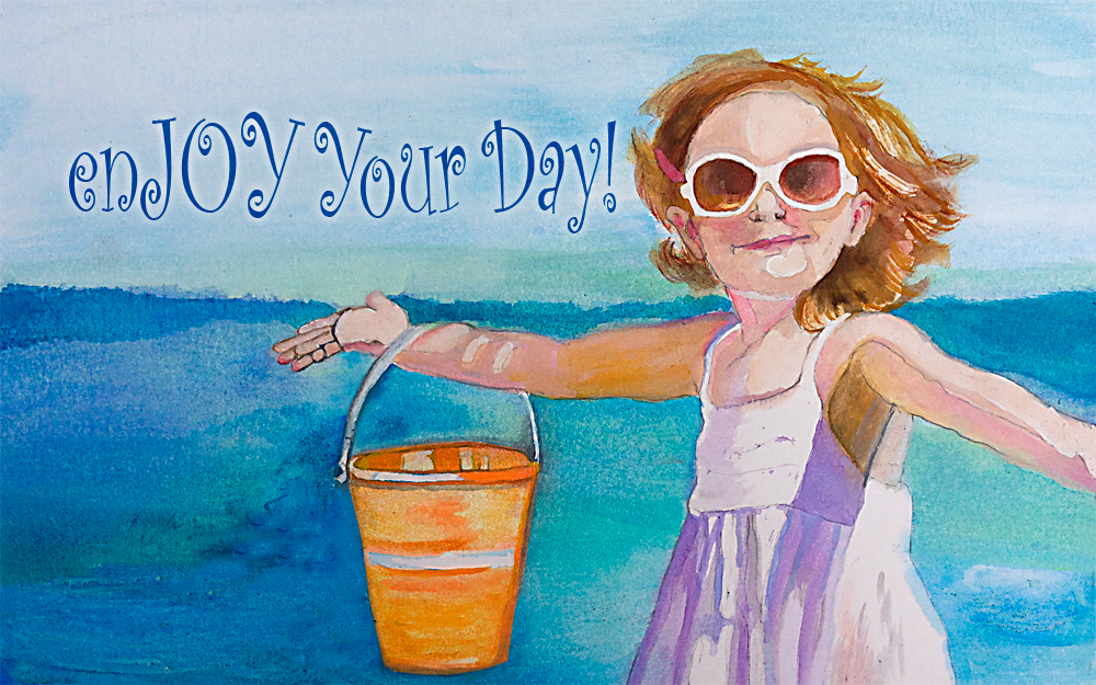 This is a watercolor image that I painted and designed for my 2014 Mother’s Day Card. I have made a point of creating my own Mother’s Day cards to send to my female friends and family for years, in honor of my own mother, who died when I was 8. Often I’ve featured my son or nieces and nephews, as I have easy access to their photos, and use whatever media their images inspired. This little girl I don’t know, but found the photo on online while I was looking for images for another project. Her expression of freedom and joy behind the white plastic sunglasses brought back some good childhood memories.