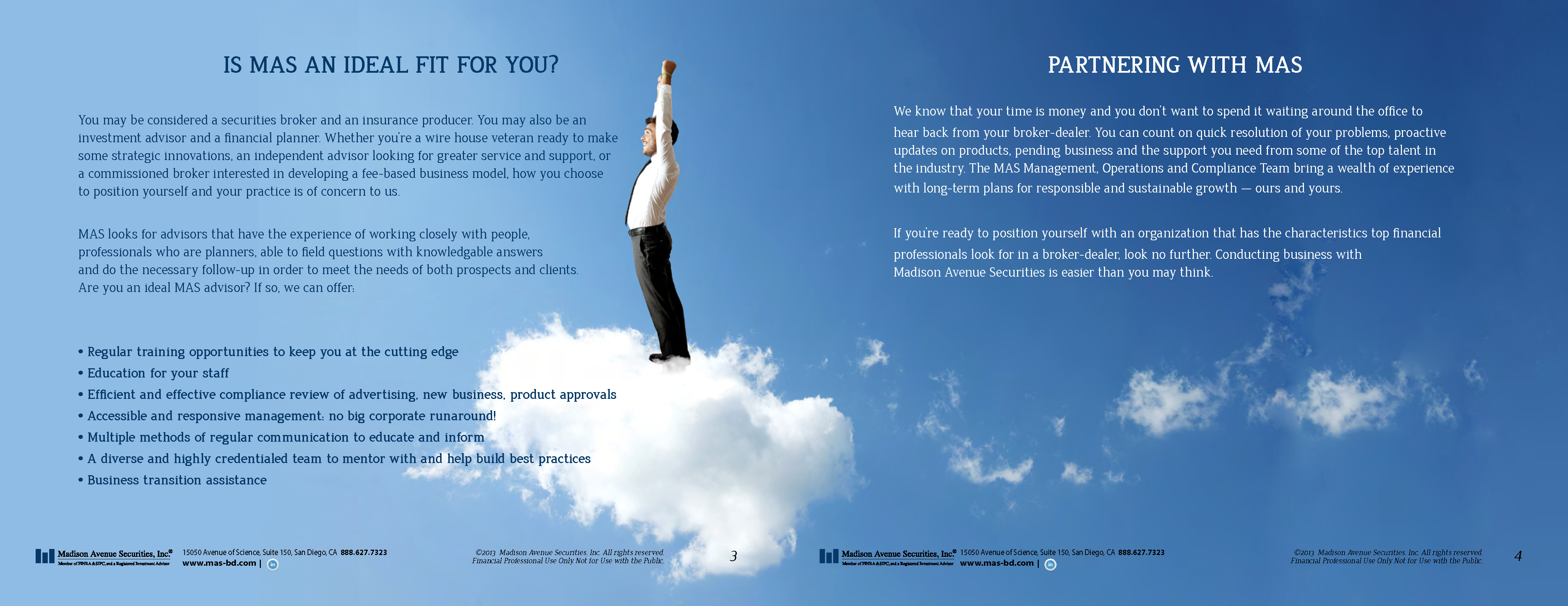 After designing the new Asset Marketing Systems brochure in 2013 and getting a lot of great press in the company for it, Madison Avenue Securities. Asset’s broker-dealer partner asked me to create a new brochure for their promotional purposes. They had done very little printed collateral, so I worked with the CFO, Marty M., and the National Director of Business Development, John D. to come up with the design and copy for it.