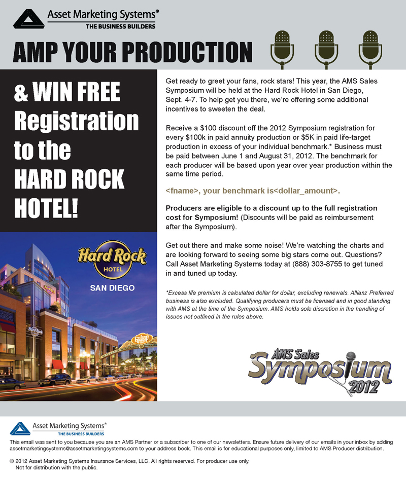 AMS 2012 Sales Symposium This email was one of several written, designed and blasted out to our agents for the 2012 AMS Sales Symposium, held at the downtown San Diego Hard Rock Hotel in September. AMS 2012 Sales Symposiumat the Hard Rock Hotel Share this: Click to share on X (Opens in new window) X Click to share on Facebook (Opens in new window) Facebook Like Loading...